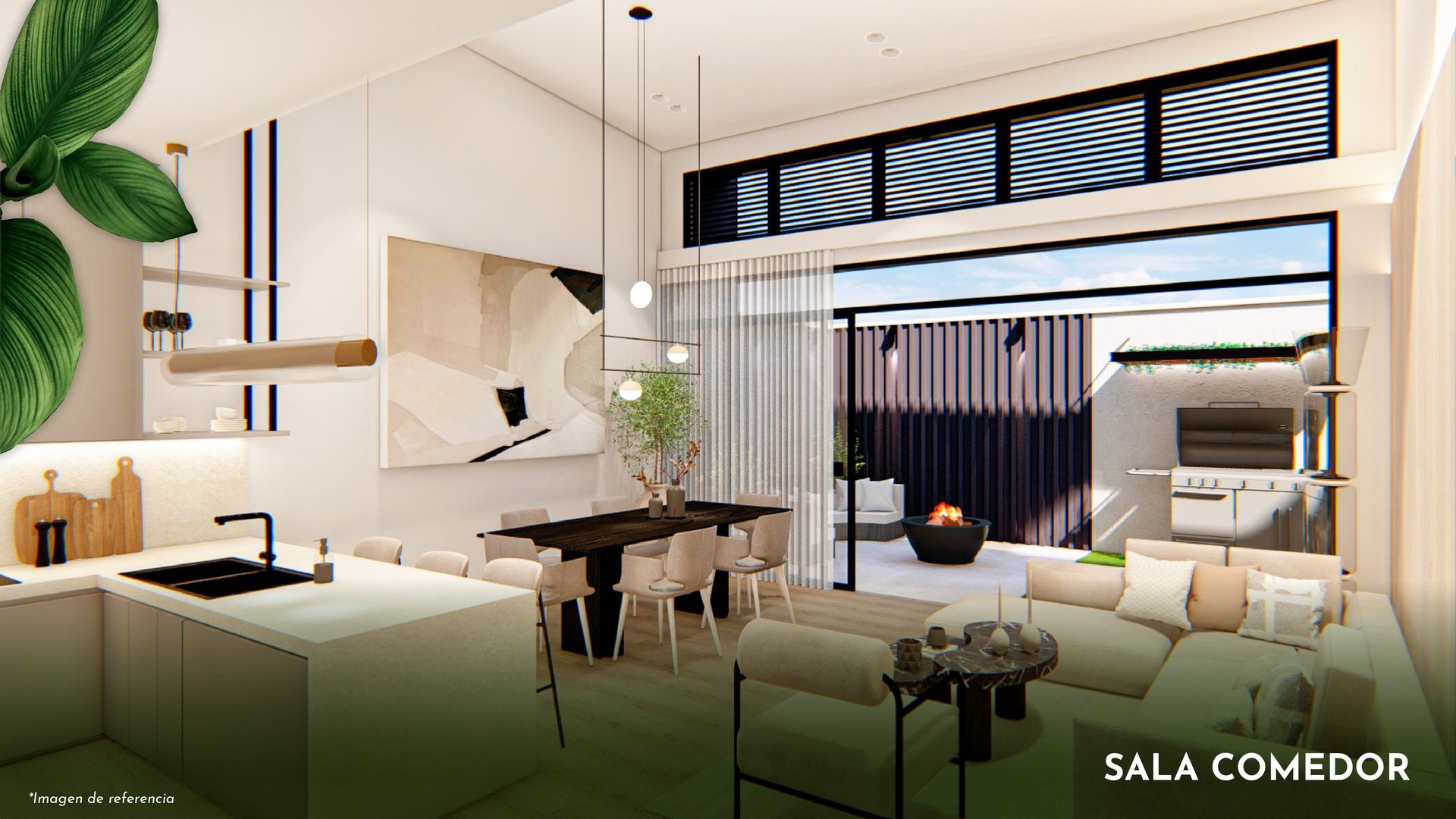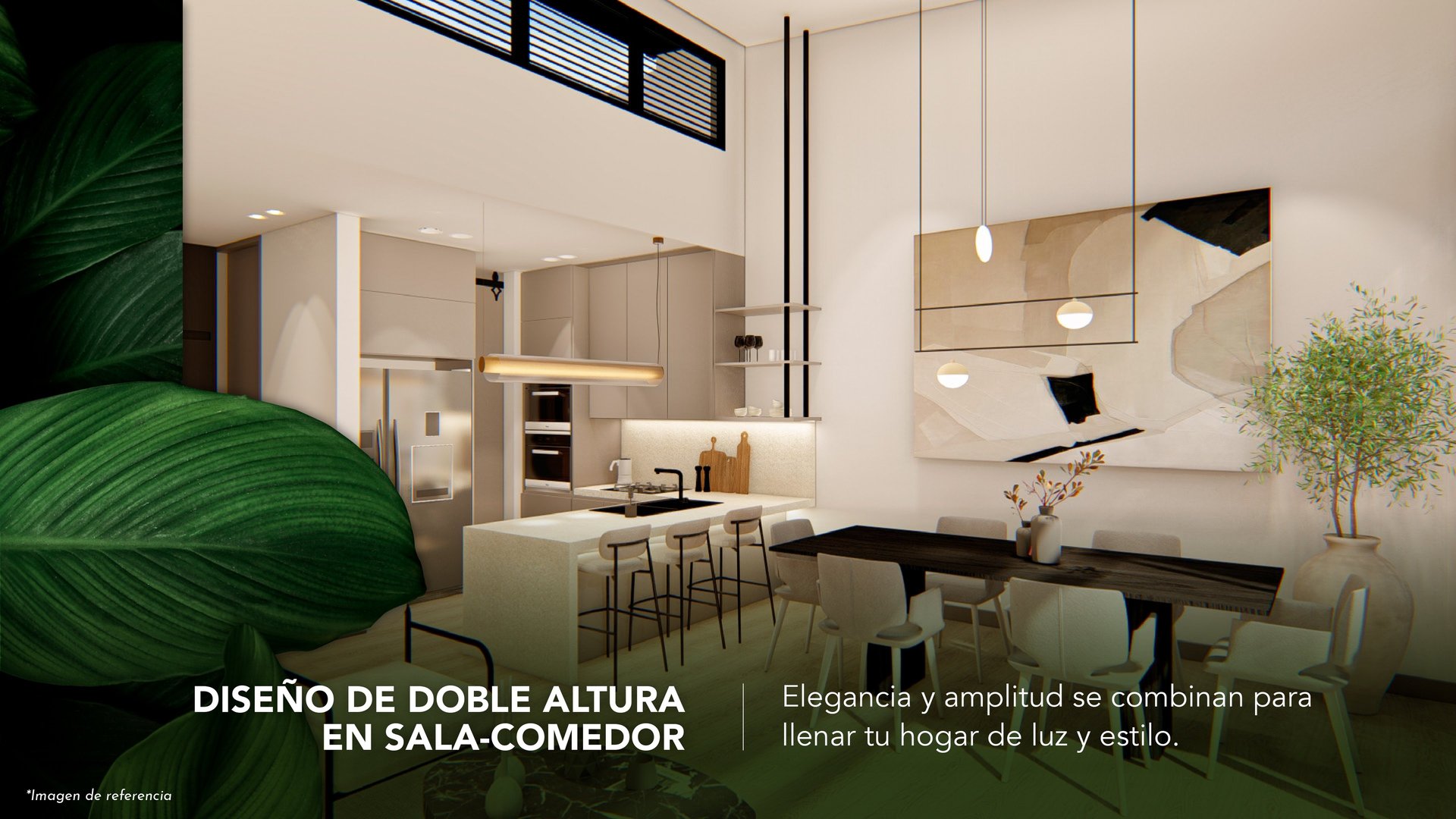 Las viviendas cuentan con diseño de doble altura en sala-comedor, acabados modernos, y una distribución práctica que privilegia la conexión entre interior y exterior, integrando la naturaleza como parte esencial del hogar.
