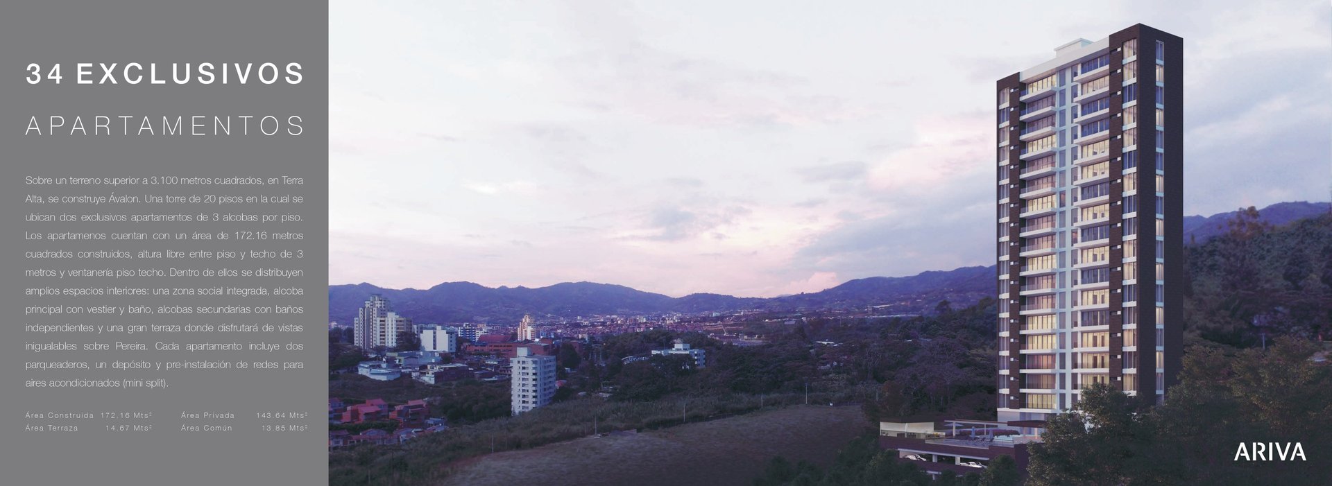 Descubra ÁVALON, un proyecto residencial único que redefine el concepto de lujo en el Eje Cafetero. Ubicado en Terra Alta , el nuevo y más ambicioso desarrollo urbano de Pereira, ÁVALON le ofrece vivir en una imponente torre de 20 pisos diseñada por ARIVA y construida para la élite.